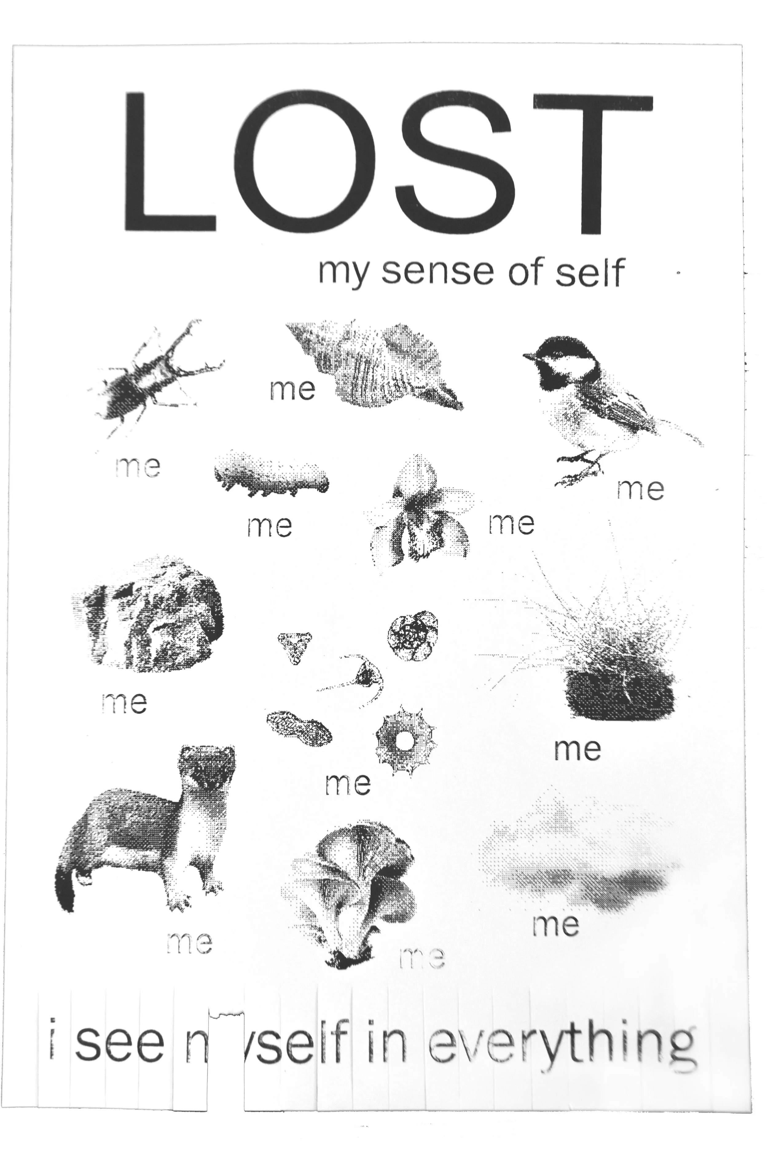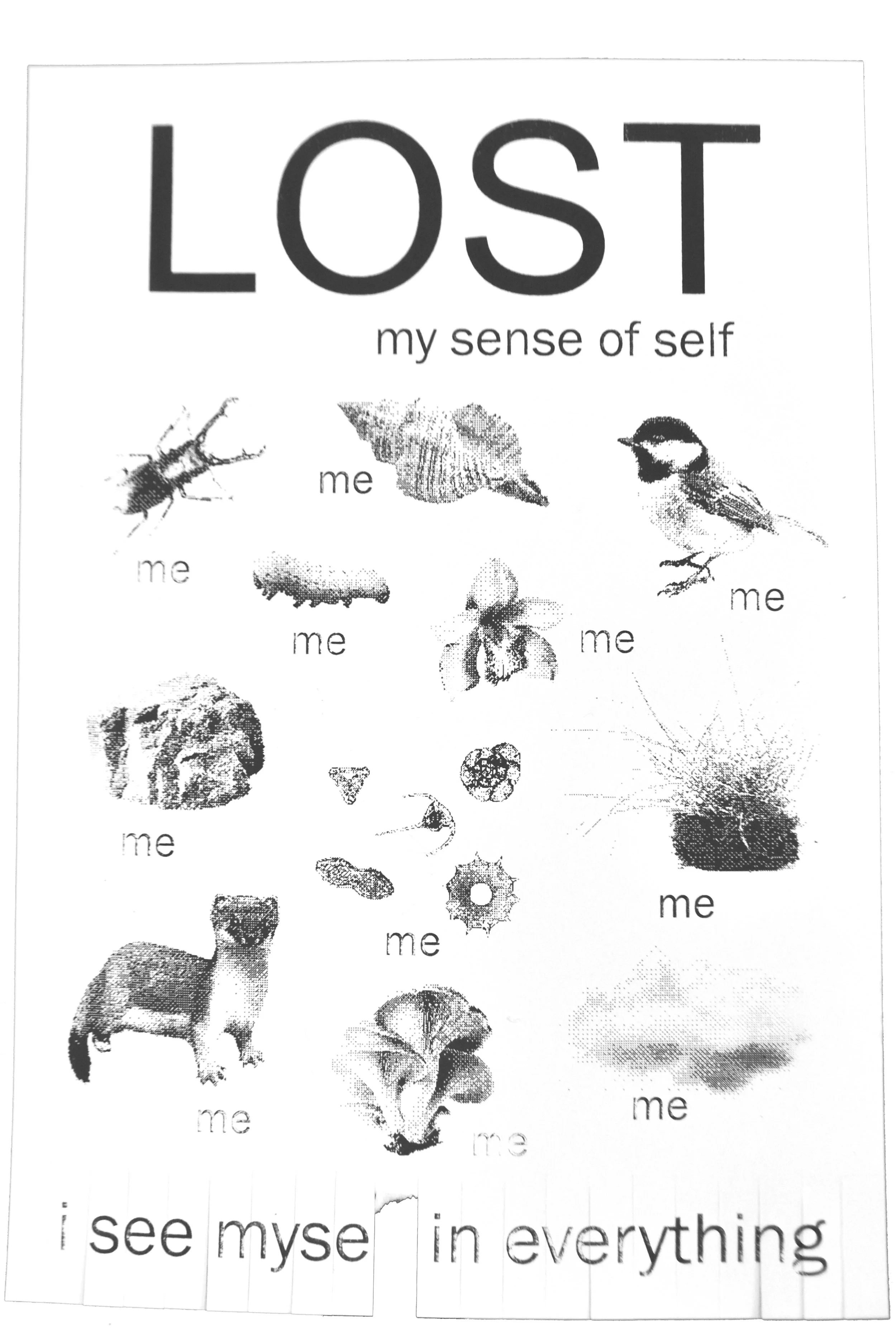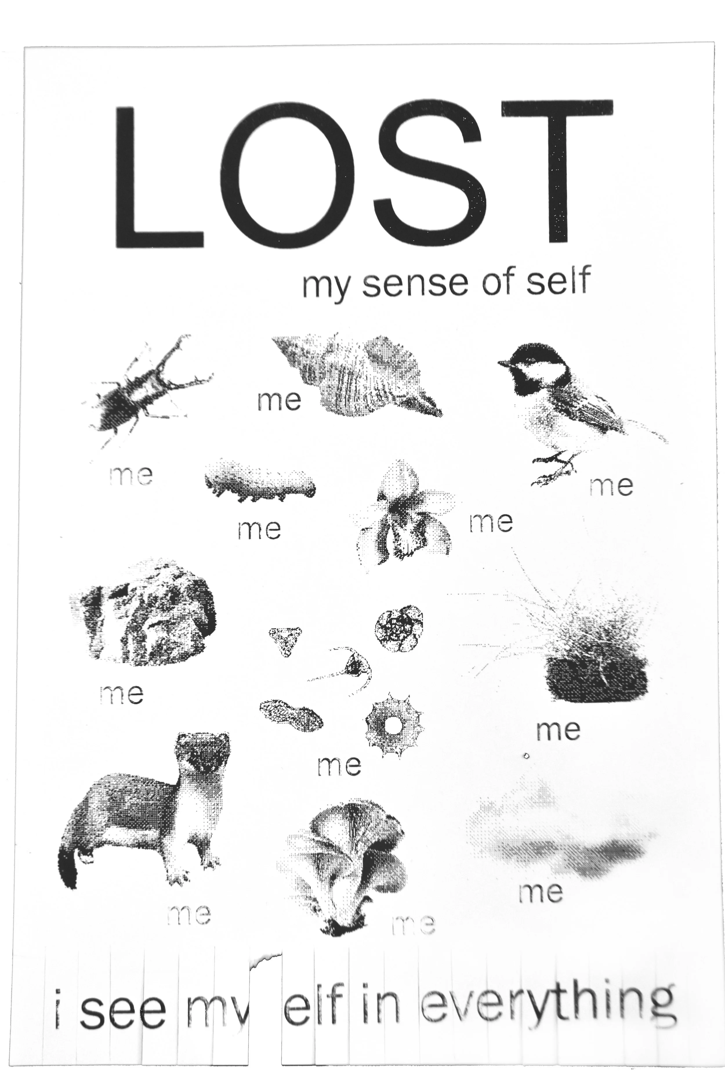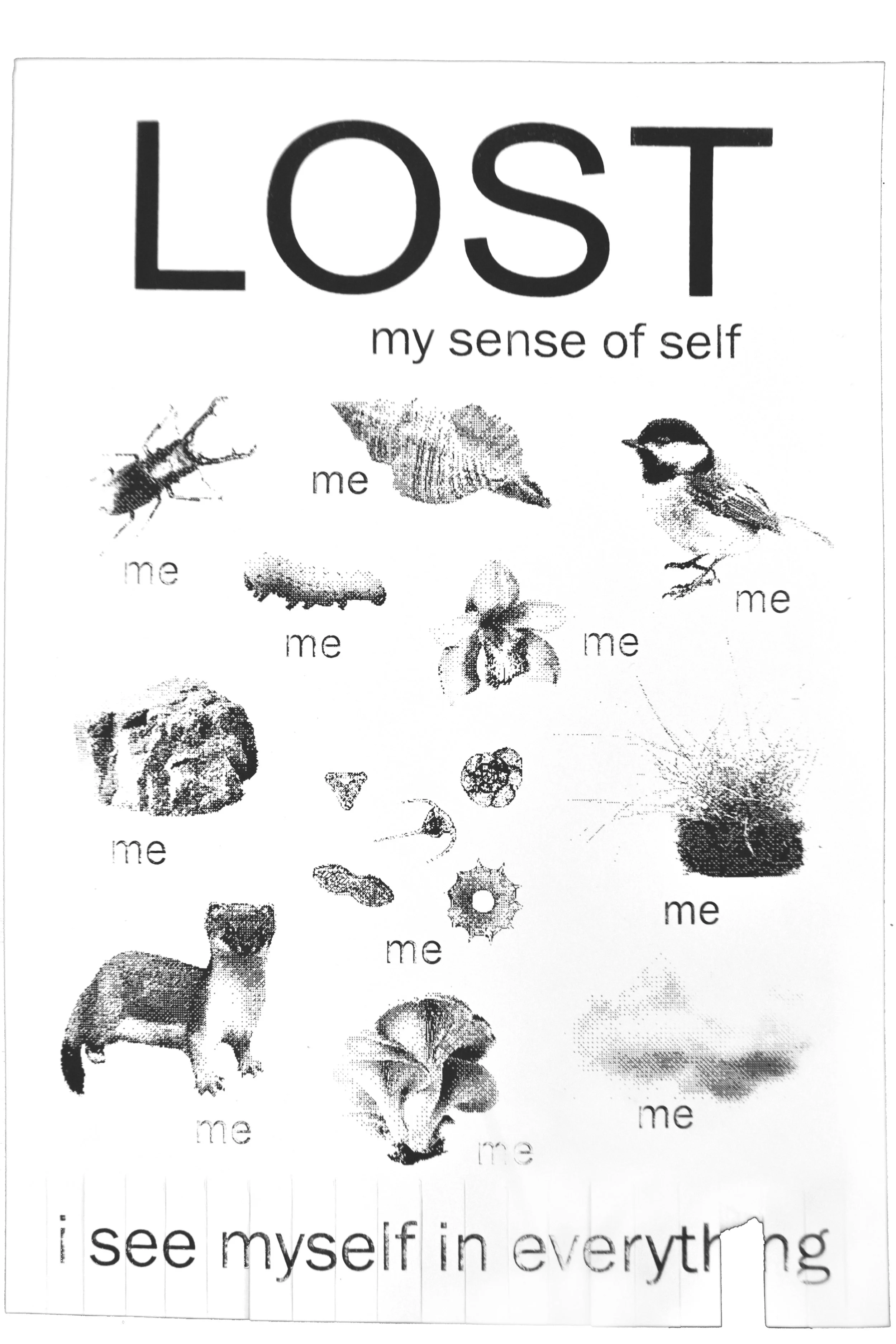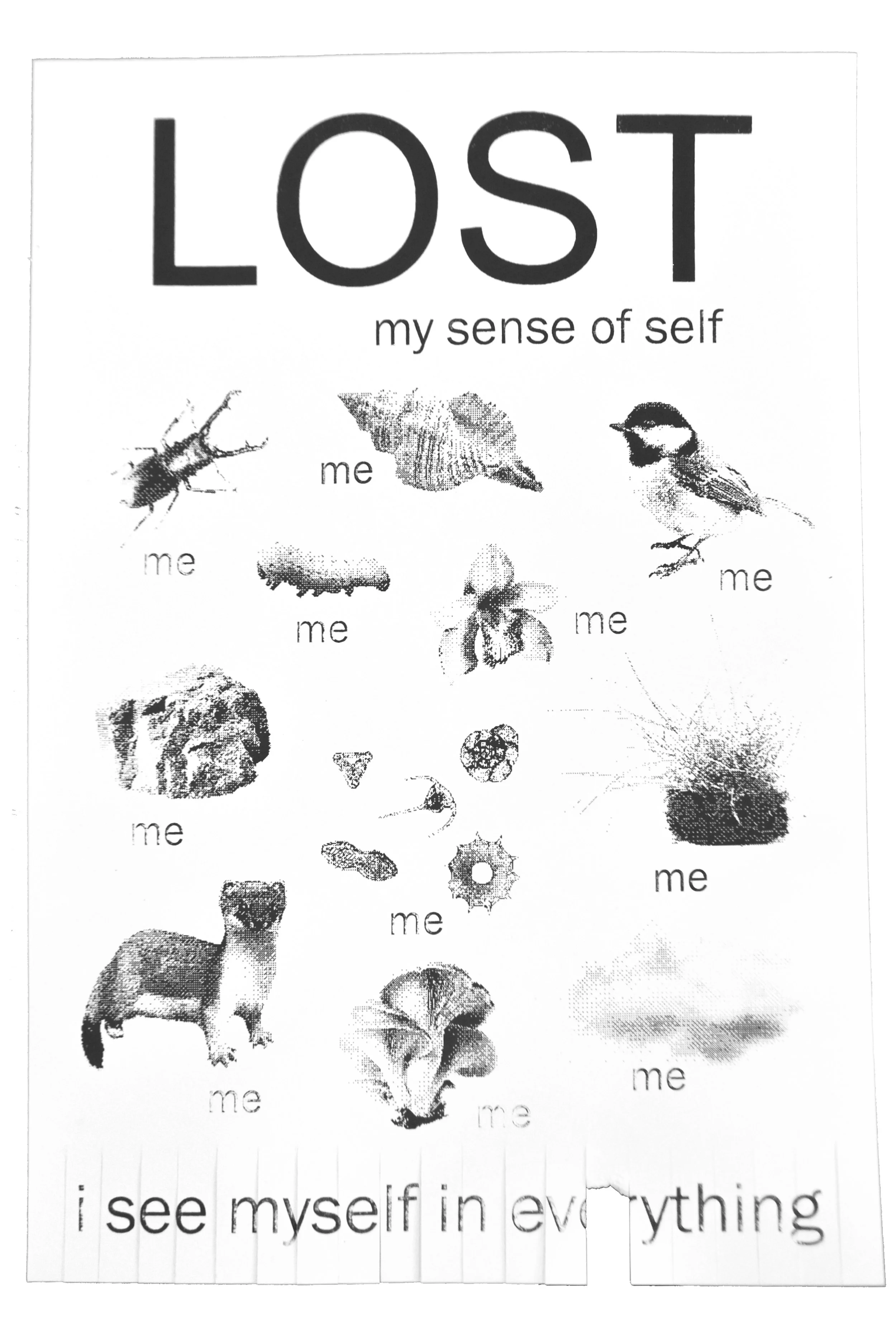 this piece uses the familiar format of “LOST” signs not in reference to a missing person or object, but to question identity and reflect on the idea of a fixed sense of self and body.