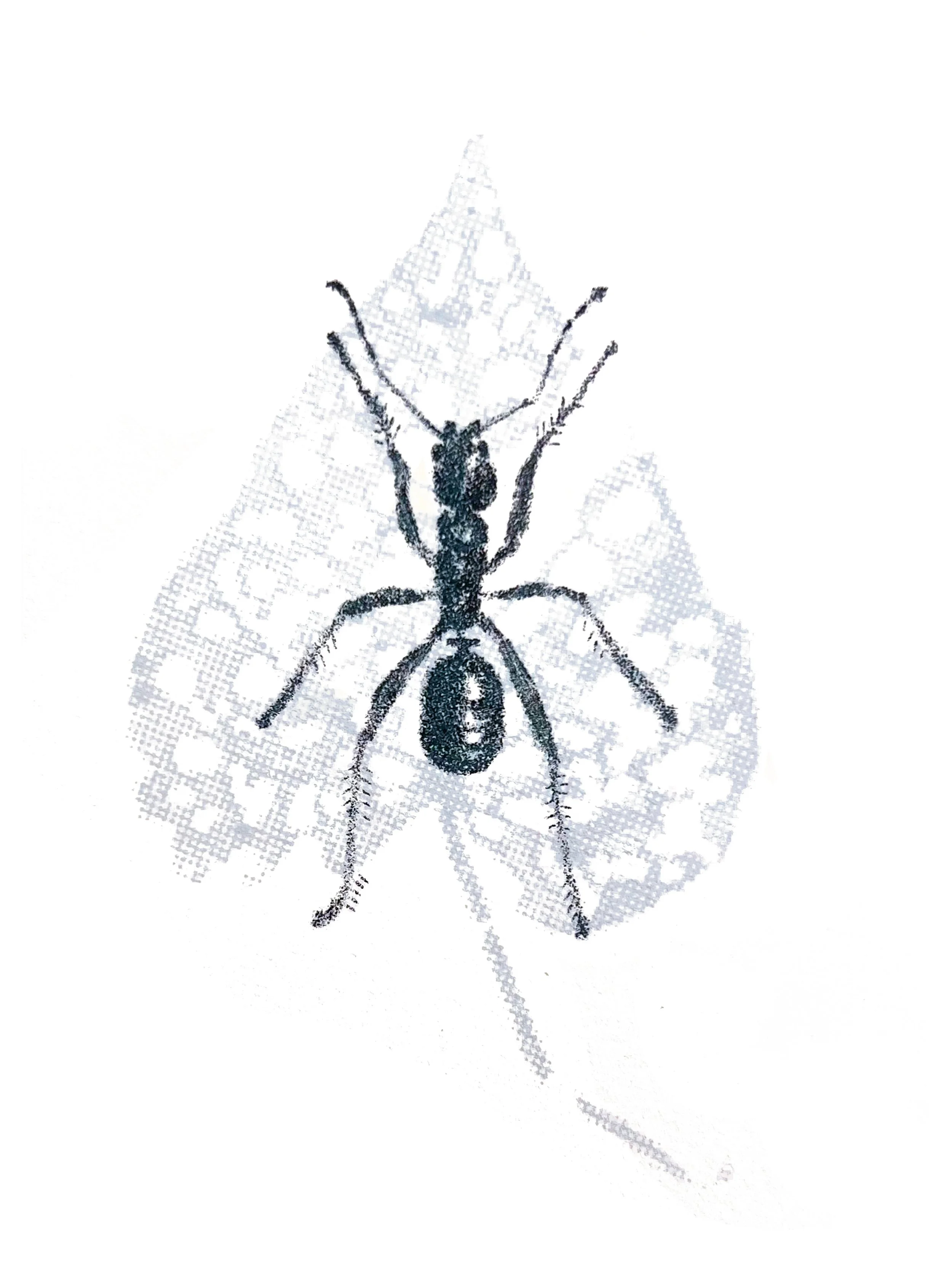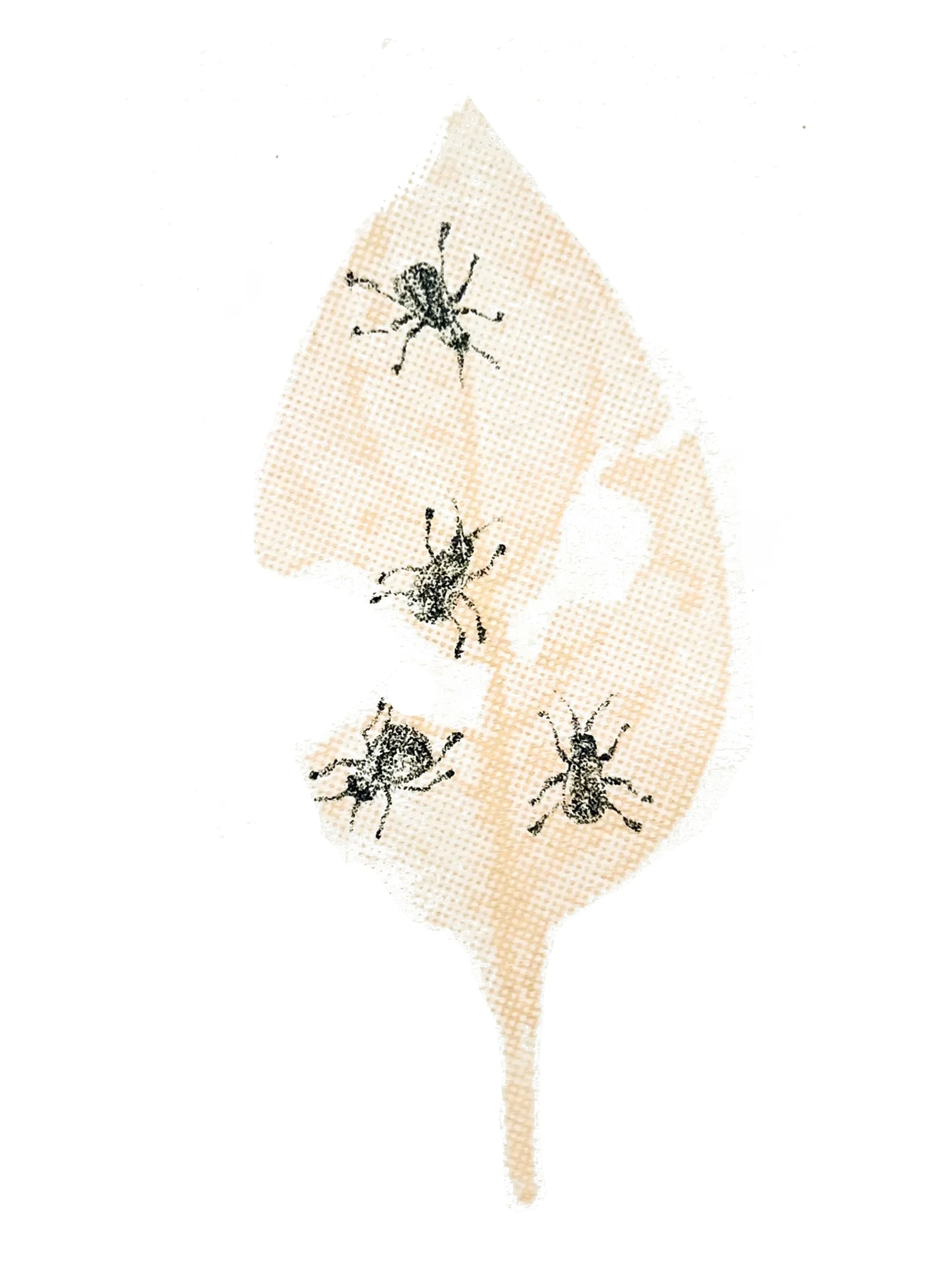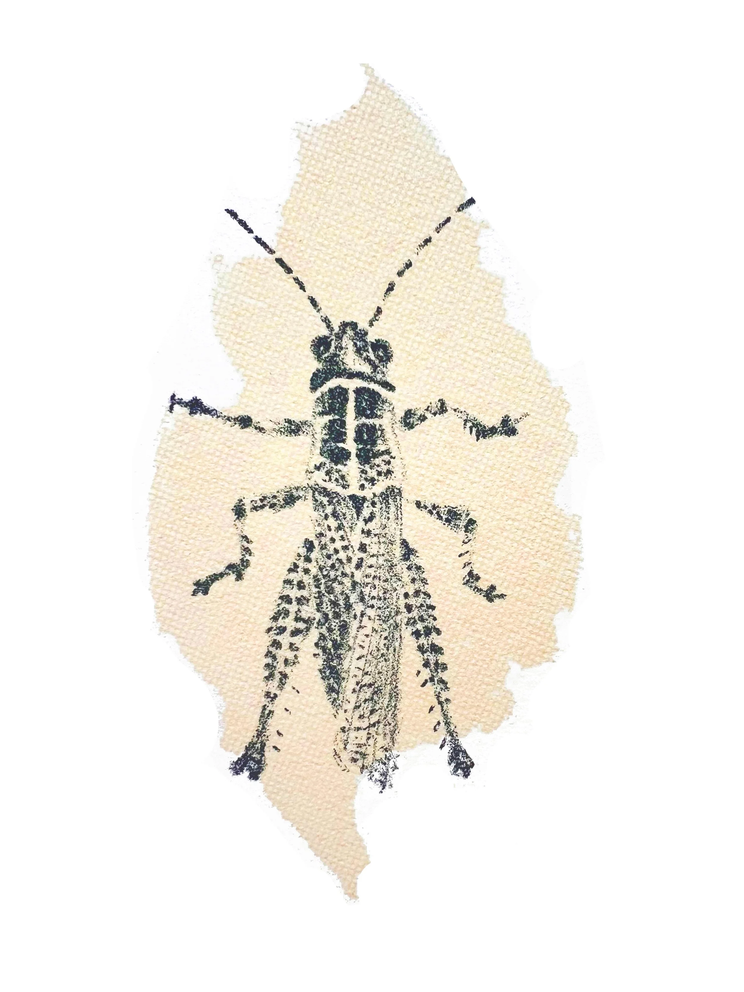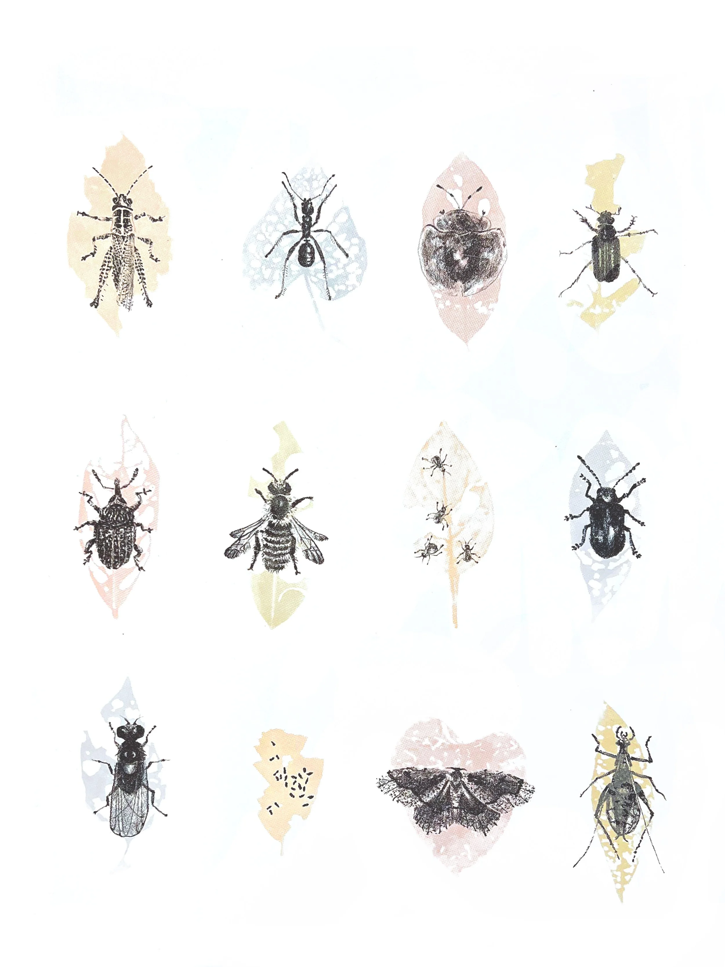 this piece combines lithographic depictions of insects with screen-printed leaves showing their corresponding “tracks”, exploring how presence can be understood through traces and what remains after something has moved on- inviting reflection on perception, memory, and the unseen patterns left in nature.