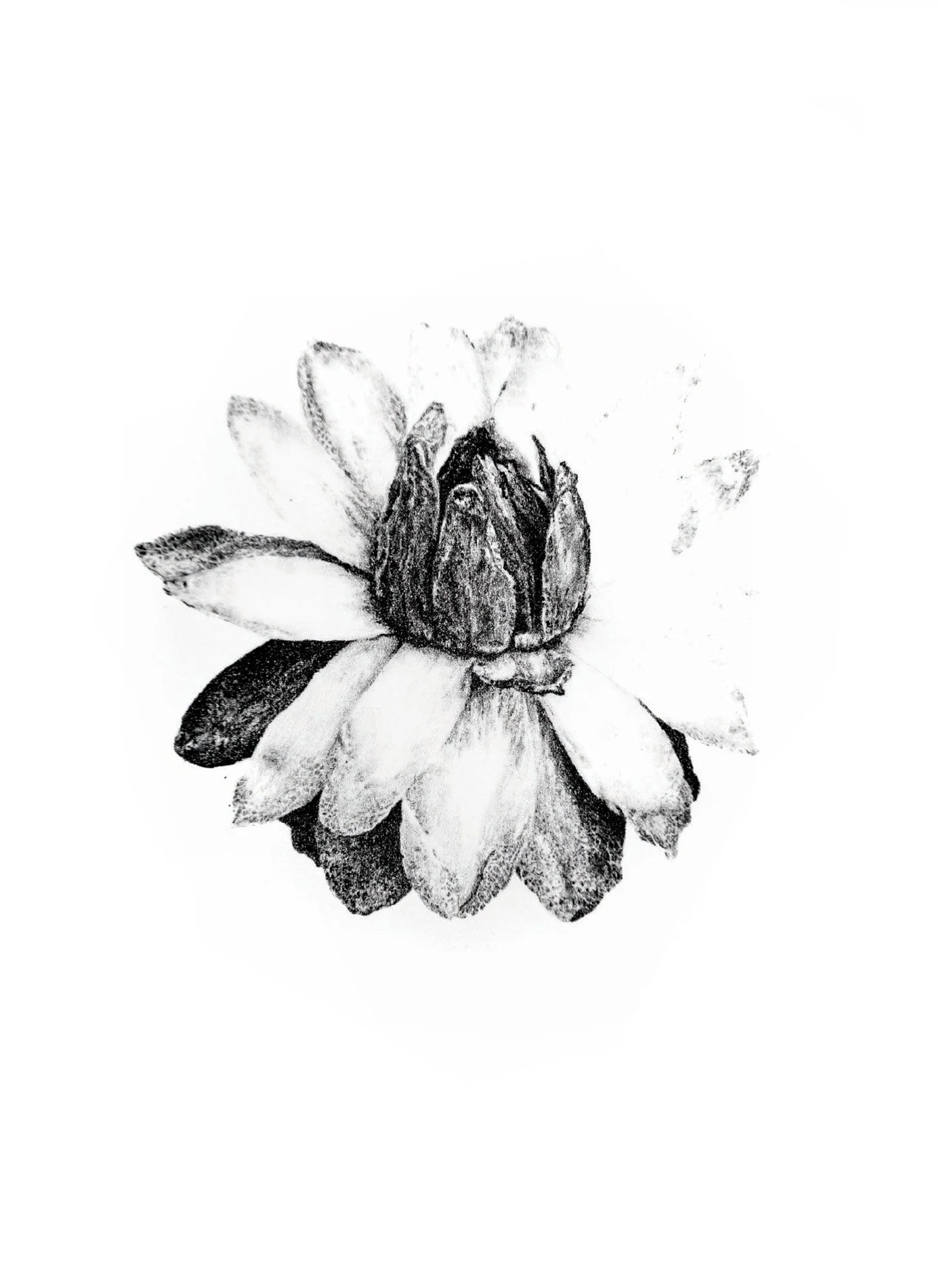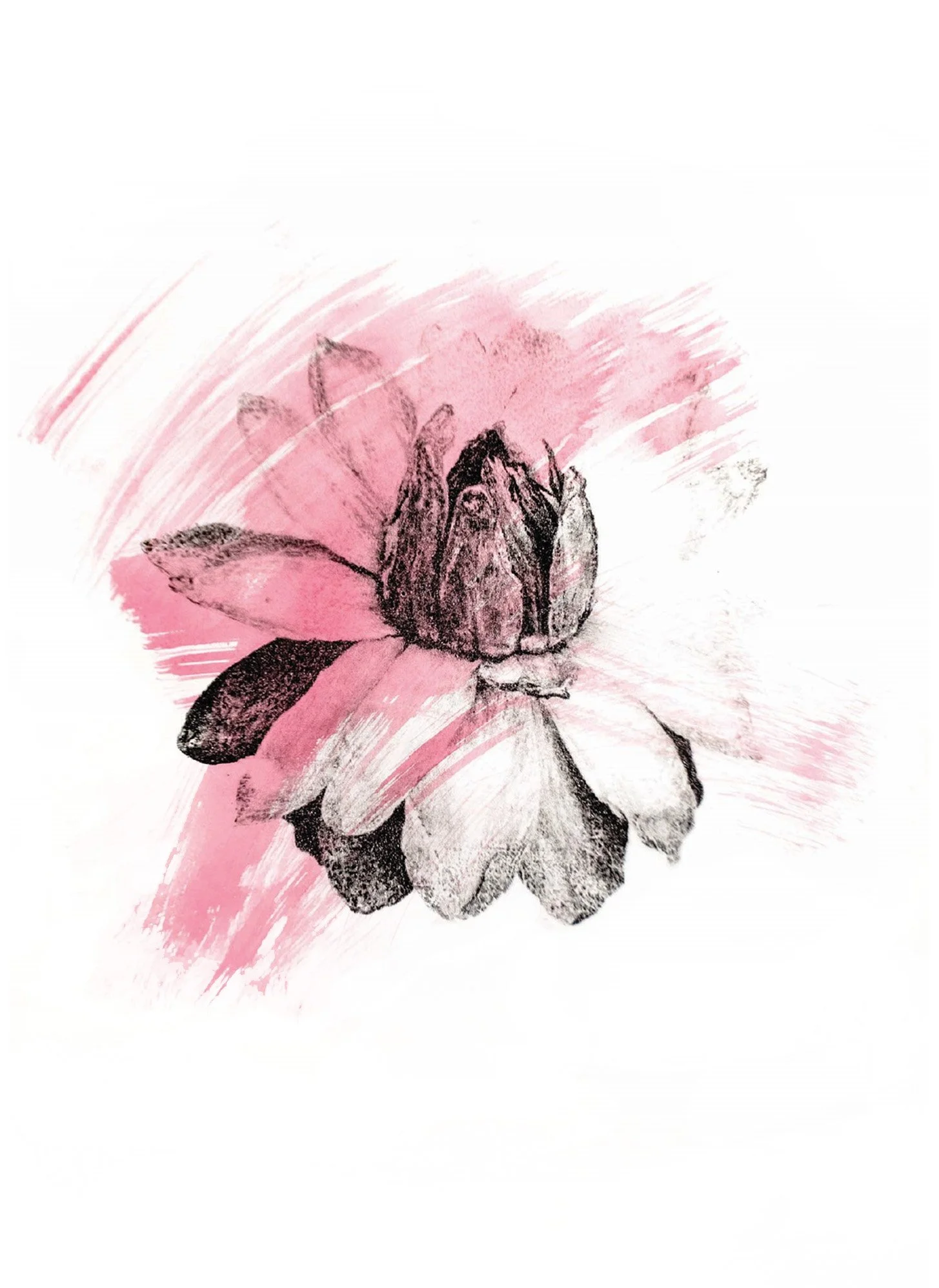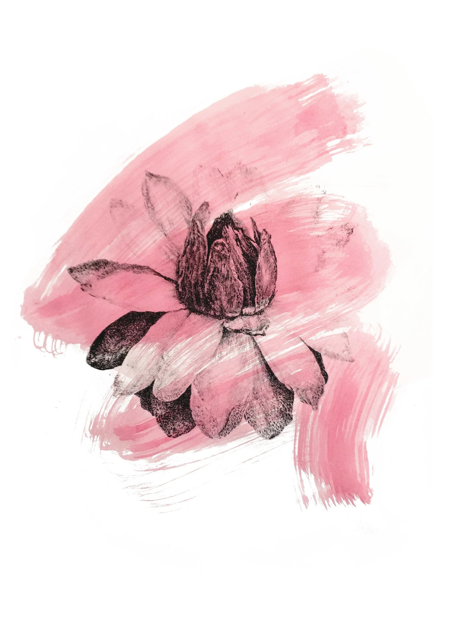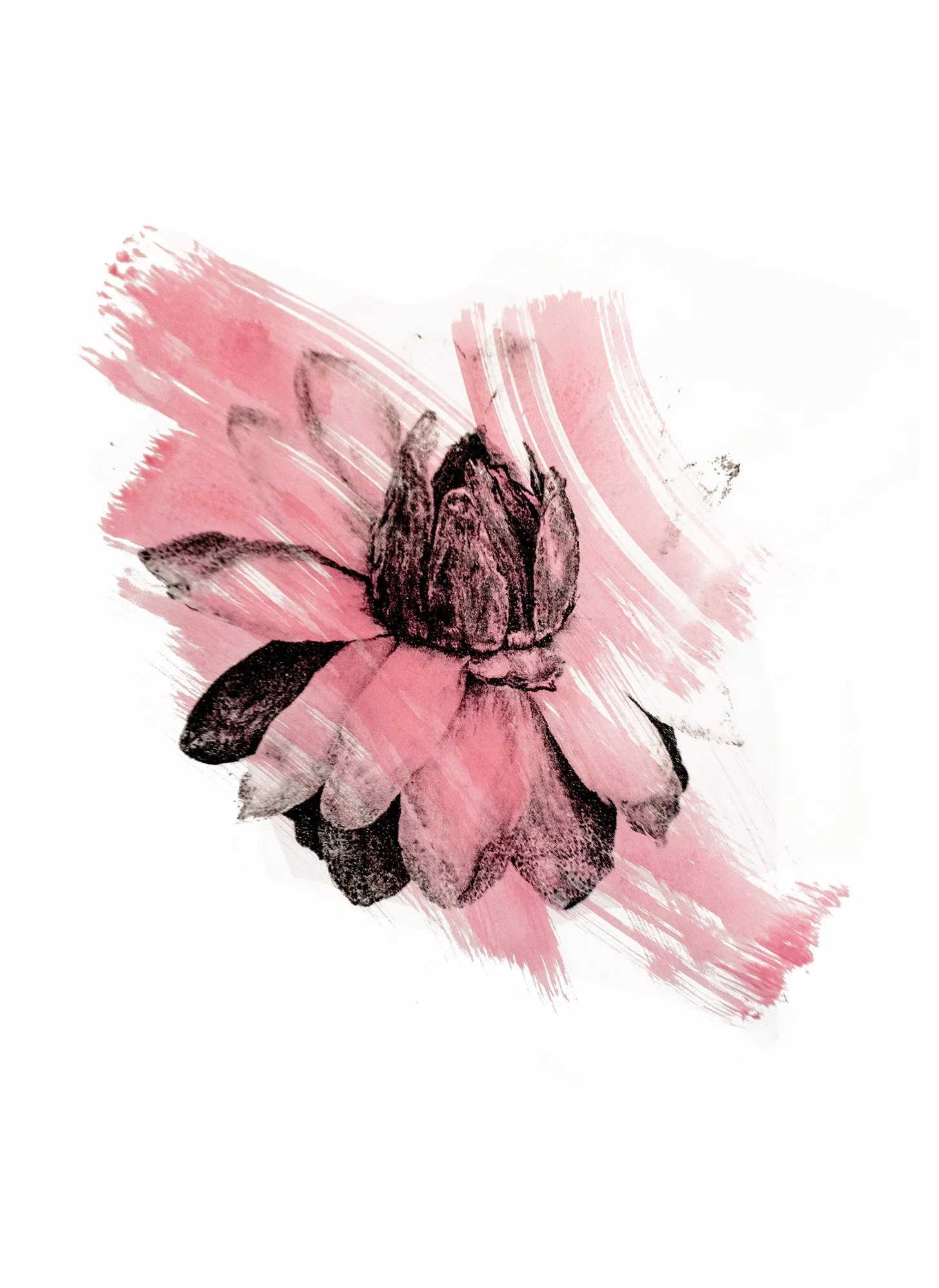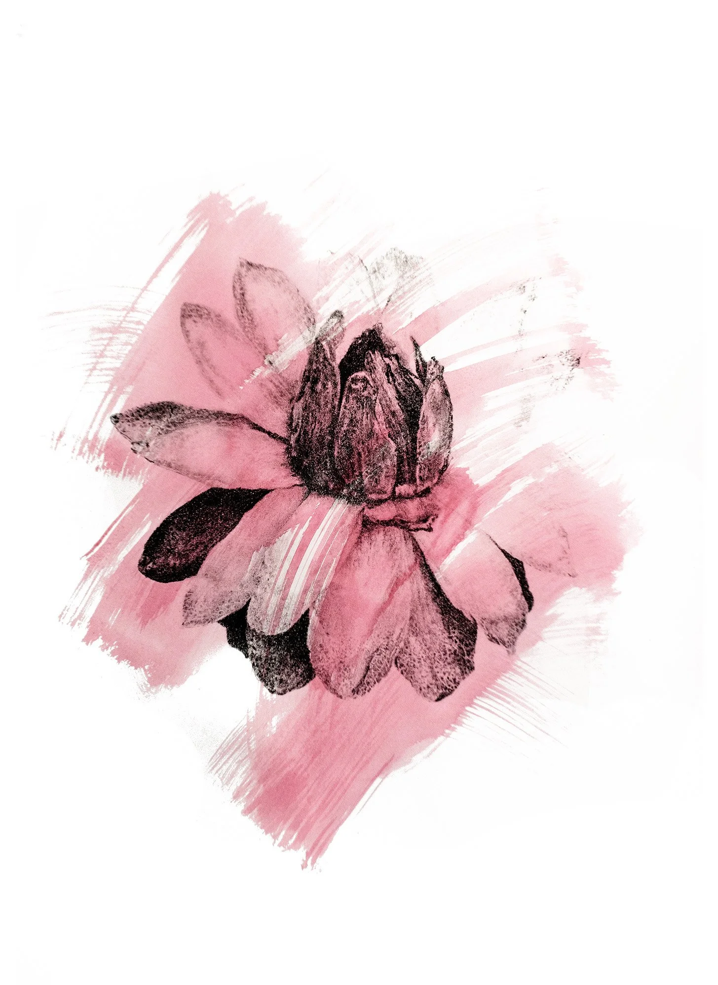 in this edition, one print remains black and white, while the remaining are overlaid with large watercolor swaths. these marks abstractly replicate the pollination process, saturating the once white flower. The pigment moves like pollen dust, settling and spreading across the image, both revealing and obscuring the flower’s delicate and complex structure.