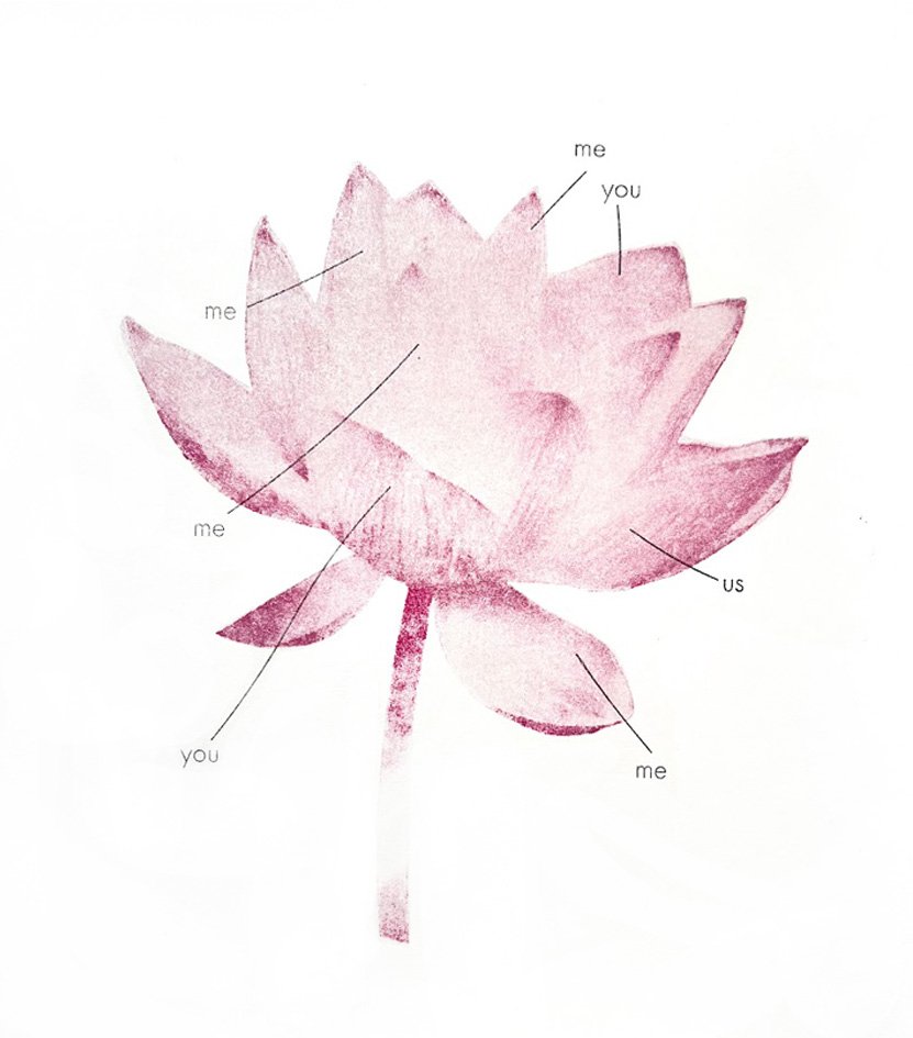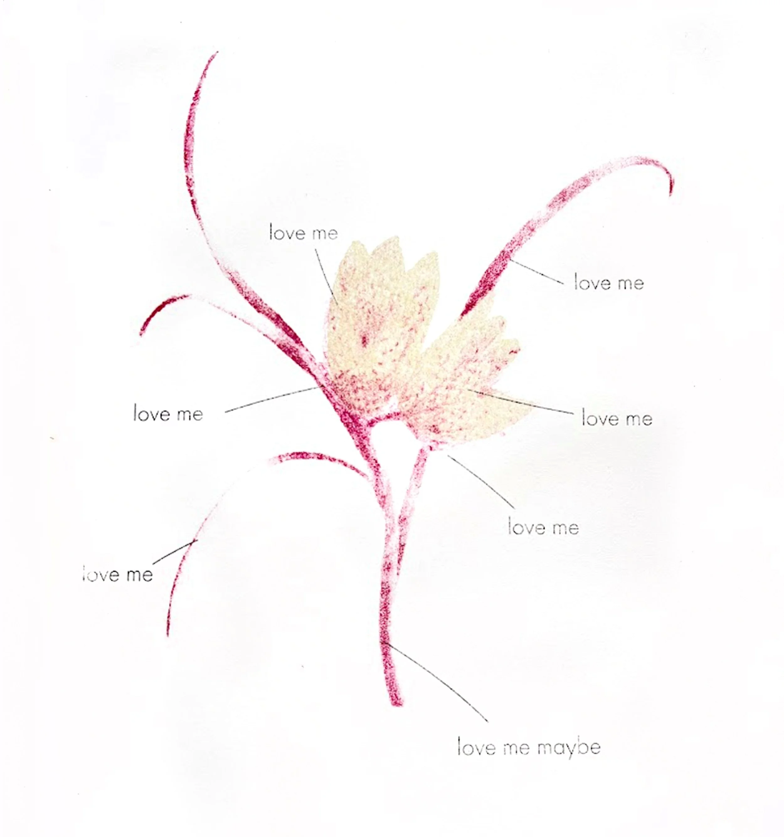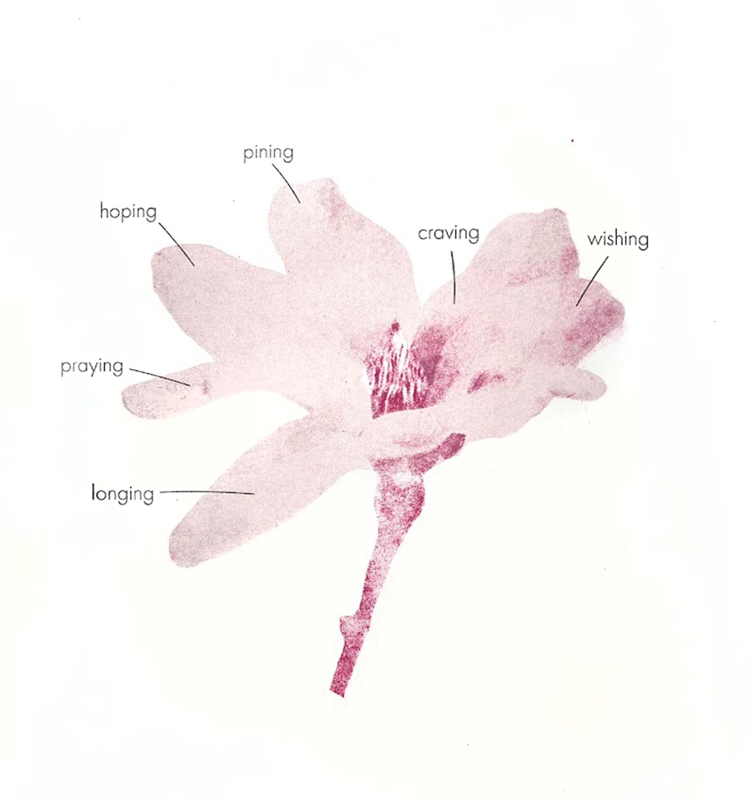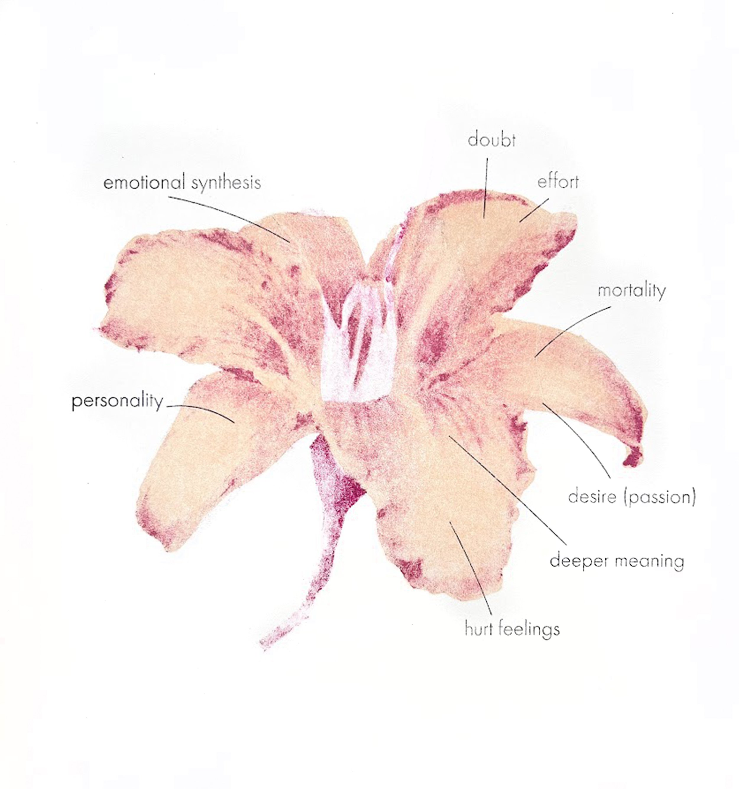 words are selectively placed on and around the flower, attaching meaning to its delicate anatomy. by isolating words and attaching them to specific parts of the subject, the work becomes both diagram and poem.